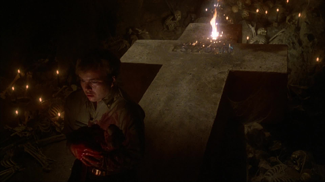 Regardless, Estaban then guides the kid through the rest of the ritual. Slowly. Like, really slowly. It’s really one of the parts of the movie that I found a little annoying, because for some reason it just takes him forever to tell the kid that he needs a human blood sacrifice to finish the ritual. Maybe he just assumed Stanley would know that because back in his day it was common knowledge. I mean, hell, even I know that and I’m not a Satanist. Maybe he just wasn’t in a rush since he’s already waited 400 years. Or maybe the writers realized that in order to pad out the movie to feature length they had to stretch out this important bit past the point of stretching and make Stanley really, really, really miserable to make the climax seem worth it.