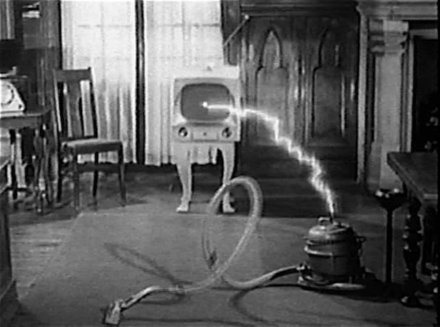 The Twonky visually depicts this idea several times throughout the movie. Whenever it zaps a human being, other than West, they all become very docile, stand up straight, and monotonely mutter “I have no complains” before shambling out of the house like one of the undead. For a film mainly focused on comedy, it’s damned eerie.