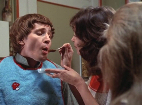 At the other end of the ‘off’ spectrum is how the other cast members treat Baby. Baby’s name is just that, Baby. He was never given or called by anything else and his mother and sisters treat him as if he were an infant for the duration of the film. Ann treats him that way as well, stroking his hair as she walks past (more like a pet, really) and talking to him as if he were a toddler, even after she voices an interest in trying to help him grow and possibly mature. This behavior is never really addressed. Everyone just sort of takes Baby’s condition (whatever it may be) at face value, without question. No one goes “Huh?….” or “Hey, isn’t that odd that a grown man is acting like an infant?” They don’t even show any real interest in taking him to be checked out by a doctor. And the entire thing is played completely straight, as if it were something happening down the street in any town. There’s not a hint of irony or campy-ness anywhere. It’s such a leap of faith that I found it a bit perplexing.