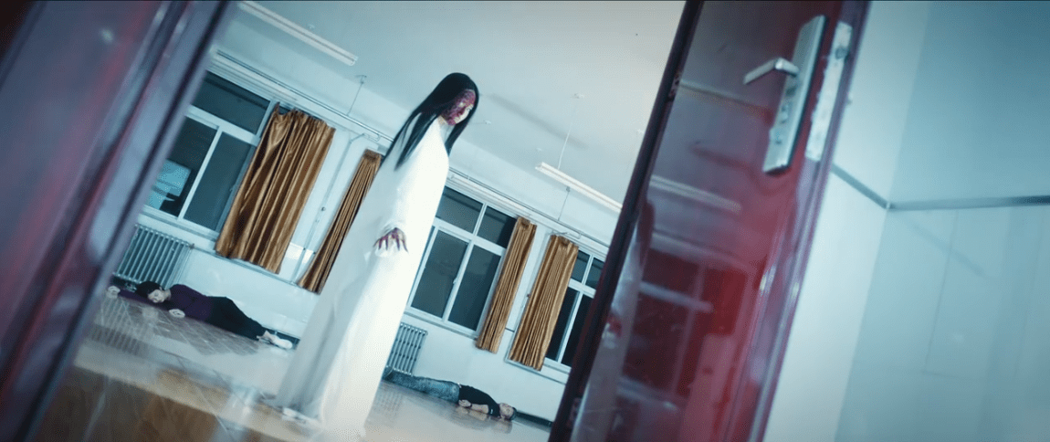 For starters, the film’s biggest drawback is that it’s story, little of it though there is, is a cheesy mess. Don’t get me wrong, it’s perfectly followable, but it’s still a mess. It’s like they borrowed every “ghost story” cliche they could think of and tried to cram it into this one movie. Except you also have to remember that this film is from China, and China has censors, so it’s every “ghost story” cliche stripped down to a PG-13 level. For example: there is a shower scene, but you only get hints at nudity, not any actual nudity. And because it’s cast is primarily students, they also felt the need to throw in an awkward “romance” angle, just to sweeten the already cumbersome plot. As a result, just about everything after the opening fire scene feels like something ripped right out of a Scooby Doo episode, but without the benefit of actually having the talking dog. You have a kooky and suspicious night watchman who conveniently lays out the whole backstory, a group of kids searching for their friend who think the best way to do this is to run around and scream her name for a solid 5-minutes, a fake out ending that makes absolutely no goddamn sense, and apparently no one is able to call the police until right up until the very end. On top of that, right from the beginning every character makes terribly senseless choices that are clearly made, not with the assumption of any common sense, but purely to set up the scenario for an “exciting” scene. The very first victim basically sets the tone for the entire film when, in the dead of night, she spends a solid five minutes following the creepy, breathless whispers of “Save me”/”Help Me” around a deserted campus (all while constantly repeating “Who’s there?”), before tearing down a gigantic seal and further following the voice into a deserted room.