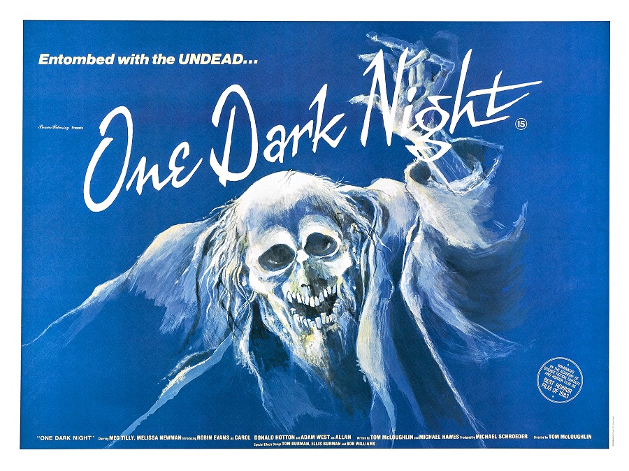 One Dark Night is an American horror film from 1983. It was originally planned for a much earlier release, but was pushed back due to repeated post-production delays. There are a couple different versions of the film in circulation. Writer Michael Hawes and director Tom McLoughlin had little control over the film’s final editing, so the ending they originally shot was altered without their knowledge. At some point, their original version was released, but without much of the effects and less footage included in the ending. To add insult to injury, the rights to the film were passed around so much that the original photo negatives became lost, leaving the film to languish in relative obscurity for quite a while since the majority of the copies released were of less than optimal quality. But those issues seem to have been resolved recently, as evidenced by the shiny new 4K restoration that has now been released. So good news is that this once forgotten gem has never looked better, and can now successfully reach the masses. But thanks to a rather slow beginning, it might take a little encouragement to keep said masses in their seats long enough to make it to the more entertaining ending.