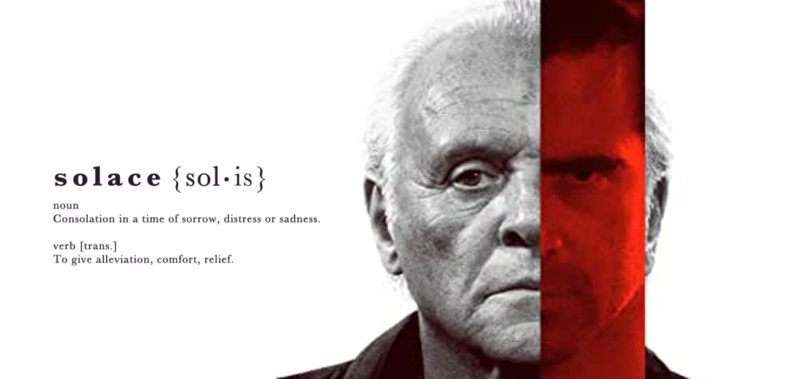 Solace is an American supernatural mystery/thriller from 2015. The script was originally written sometime around 2000 and was shopped around to several studios. At one point, New Line Cinema got their hands on it and wanted to rewrite the plot as a sequel to the film Se7en (they wanted to call it “Ei8ht” *barf*), with Morgan Freeman’s character Detective William Somerset coming back after he had somehow developed psychic powers, and then using said powers to solve the crime…. Or, depending on where you get your stories from, the project was initially int3nded (yes that was an intentional spelling, don’t @ me) as a Se7en sequel all along before getting nixed. Either way, (and blissfully for all those involved,) Se7en director David Fincher thankfully put the kibosh on that travesty of a plan and Se7en was spared the indignity of a cheesy sequel. Or at least Morgan Freeman was spared the indignity, because the film still ended up being tweaked and made anyway, this time with Anthony freaking Hopkins in the lead role. A choice which simultaneously helps elevate the film beyond its pulpy plot and highlights all of its still very cheesy flaws.