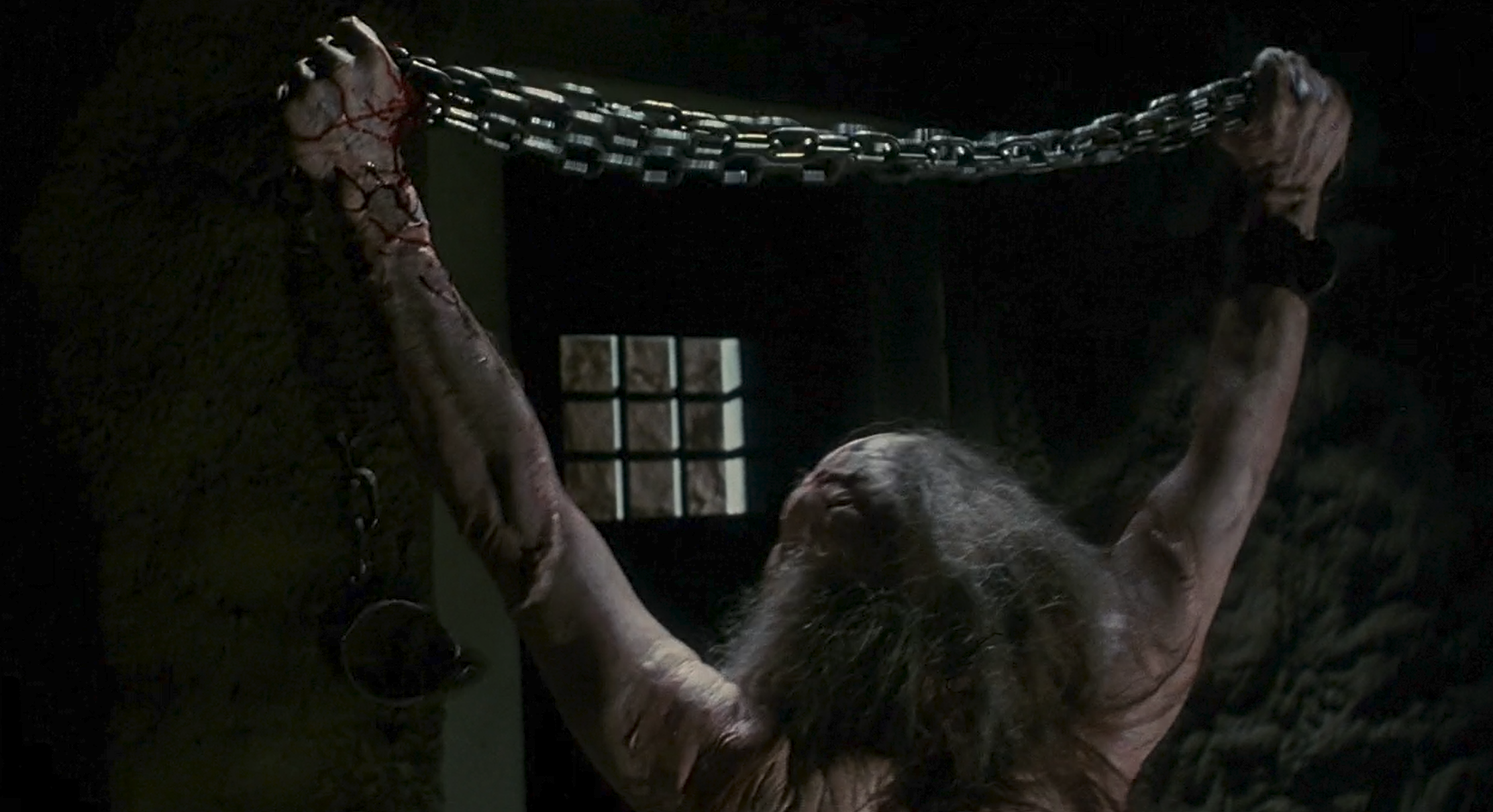 Then piggybacking off that, if it took as long as the film suggests to both discover the Duchesses’ body, and to find John and his family and get over to Italy, AND you’ve established that no one else knew about the castle freak in the castle basement, HOW IN THE HELL IS THAT GUY STILL ALIVE? It probably took weeks to get all that shit straightened out, so even assuming he had a sufficient water source, shouldn’t Castle Freak be, I don’t know, dead at this point? Or at the very least severely weakened? Yet he somehow manages to find the strength to stand, escape, and stealthily hide and murder people, after 40-some-odd years of torture, at that exact moment? How freaking convenient. Dude could have ripped his damn thumb off a lot sooner than that and saved himself, and everyone else, a lot of trouble.