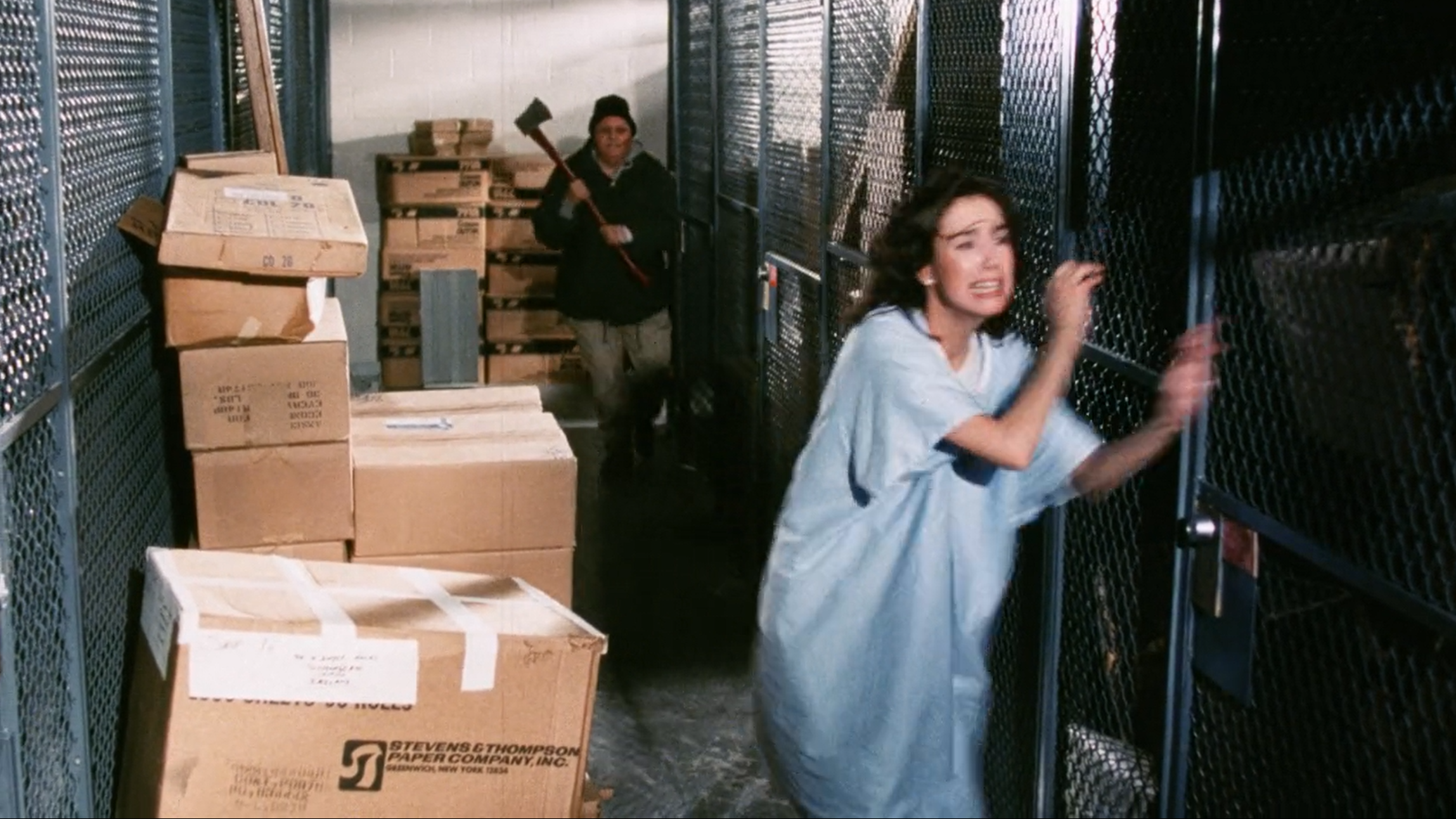 What helps keep the movie entertaining, however, are the oddities, and there are a lot of them. You’ve got a female killer who dresses like a man, hates women, and apparently likes to eat the bones of all her meat products. The building superintendent (?) walks around with his shirt half unbuttoned at all times. Every time someone is seen running it looks like they’ve never had to do it in their life. Nobody seems to be able to hear a woman screaming her bloody head off from the next room…Unless of course it’s the bad guys, and said woman is located several rooms away with multiple concrete walls between them, and on the other side of a warehouse.