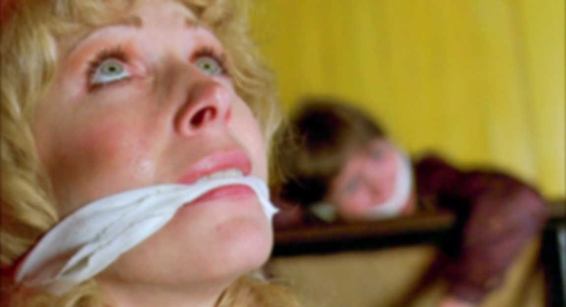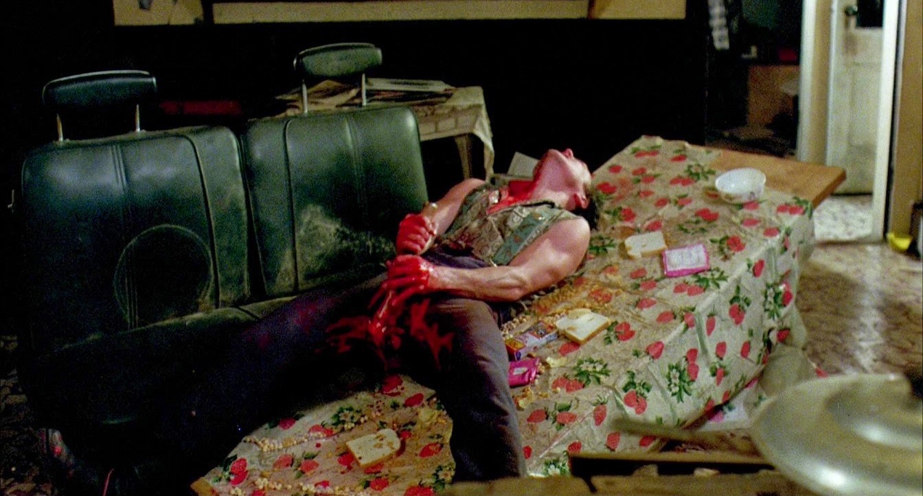 Also, I see the movie is often labeled as a comedy or satire, but this is honestly the kind of film that walks that fine line of “was that intentional or not?” when it comes to how it deals with humor. The two hick sons are essentially real-life versions of cartoon villains with a particularly repulsive mean streak, and their mother really isn’t all that much better. They watch commercialized television, eat gobs of sugary cereal, and their house is filled with various cheap nick-knacks and TV merchandise, covering everything from sitcoms to Sesame Street (seeing the Sesame Street sheets on their bed after just raping a woman offer an especially creepy touch). So I can see how the filmmakers may be making a comment regarding over commercialization. They also “exercise” every day, which involves doing a lot of push-ups and various army-type drills involving knives and watermelons meant to practice their killing technique, all set to Rocky-esque training montage music. They spend unusual amounts of time arguing on whether punk or disco is better, and at least one person is killed by being suffocated by a large, plastic boob. It’s all absolutely ridiculous, but it’s also treated seriously enough that it’s really hard to tell what they were going for, especially after reading later that some of this lunacy was dead-ass meant to be taken seriously. So it’s probably just better to take in the movie for what it is, because if you overthink it you’re going to be very confused.