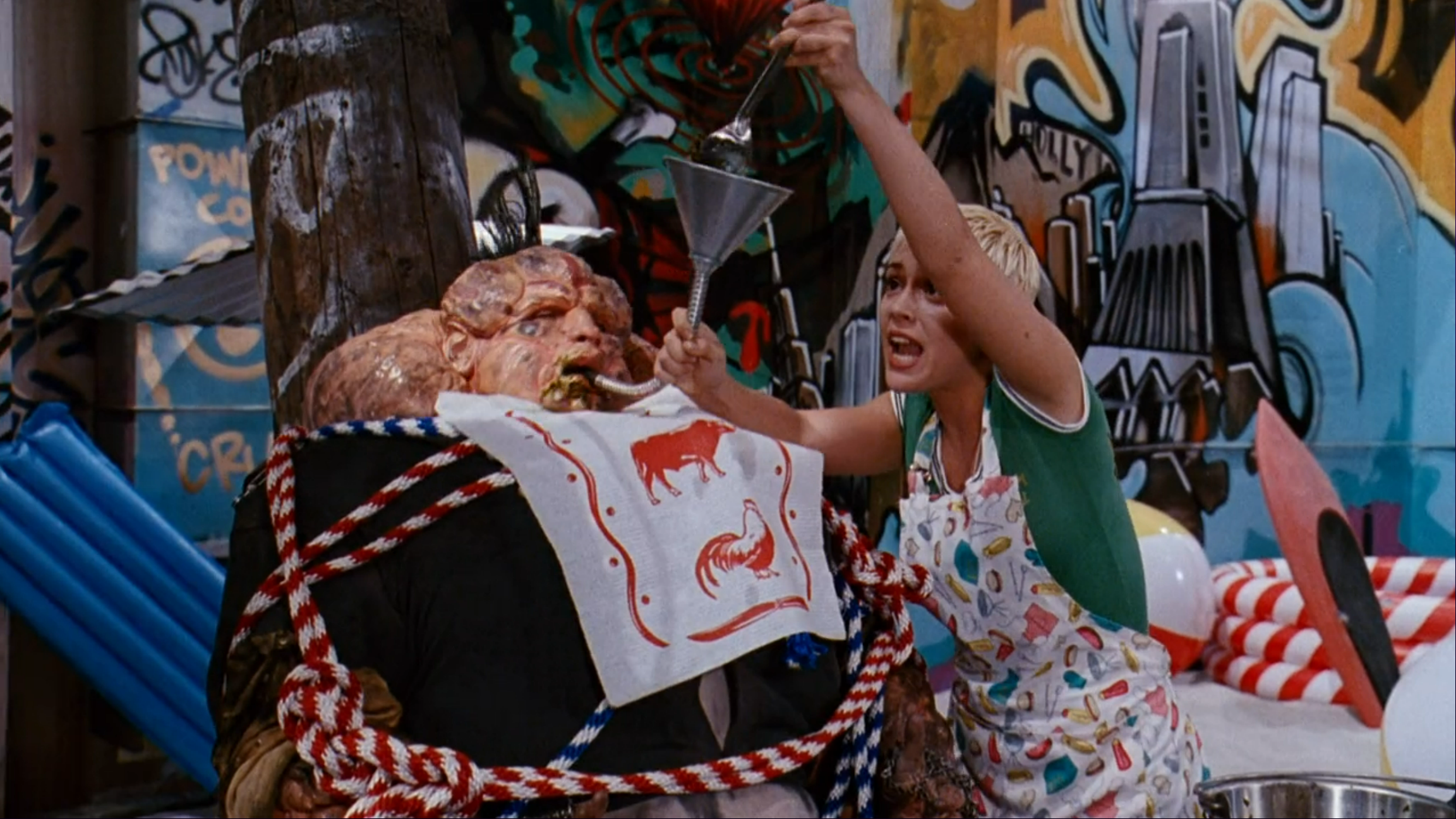 The rest of the film’s story though? Rubbish. It feels like they were trying to make some unholy combination of The Warriors crossed with the Super Mario Bros. movie that came out the year before. Which feels like a truly bizarre choice, considering that that last film flopped so damn hard that Nintendo didn’t give Hollywood another chance to work on one of their properties again for almost 25 years. So, perhaps needless to say, the poor film just doesn’t make a whole lot of sense. Mostly because there’s just too much extraneous story stuff going on that’s built up, but never really pans out or ends up being necessary to the overall plot. Characters are implied to be important, only to be quickly discarded as a lame attempt to manipulate audience emotions at the earliest possible opportunity. The whole “rebels” angle is really only there to provide a colorful, non-dystopian locale for the final battle. Things that could have been important or meaningful plot points are introduced late in the game via throwaway lines (“Oh, btw kid, did I mention I killed your dad?”), as if the heroes needed yet another reason to try to stop the bad guy? And of course we’re never really told how the medallions work, or why the boys can’t seem to activate them. I mean, it’s kinda implied, but because the storytelling here sucks, it doesn’t end up landing the way they planned. So during the big reveal at the end, what they WANT the scene to convey is that in order to get the body medallion (aka super strength) to work, the bearer must first show that they have inner strength (I think that’s what they were going for, anyway). Which might have been deep and meaningful if they had pulled it off. But what we end up seeing on screen is Billy being unable to use the medallion in his time of need and then throwing the damn thing away from him in disgust like a toddler throwing a temper tantrum. So, *splat* goes any meaningful point they were trying for there.