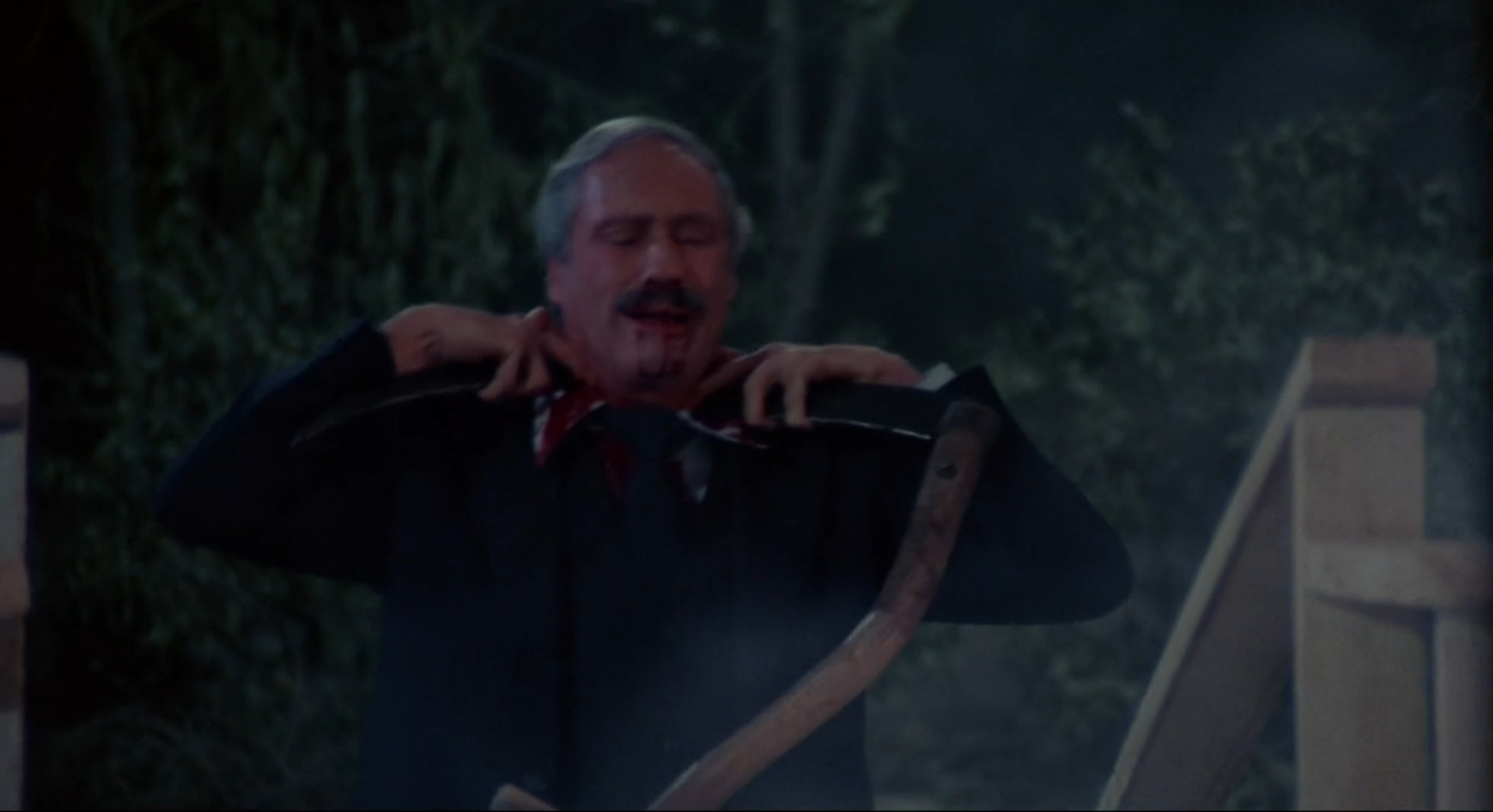 The movie is also a lot more violent than Hooper’s last outing. TCM often gets remembered as this really violent film. But in reality it’s actually shockingly subtle. Beyond a couple of quick whacks with a hammer you actually see precious little in the way of blood or gore in that film. Not so in Eaten Alive. True, some stuff happens just out of camera range, likely due to budgetary constraints. But people are still getting shot, stabbed, beaten, eaten and sliced through the damn neck. So there’s quite a bit more here than you might otherwise expect. Most of it isn’t particularly gruesome, but it does have a couple of memorable shots that should at least appease most of the blood fiends.