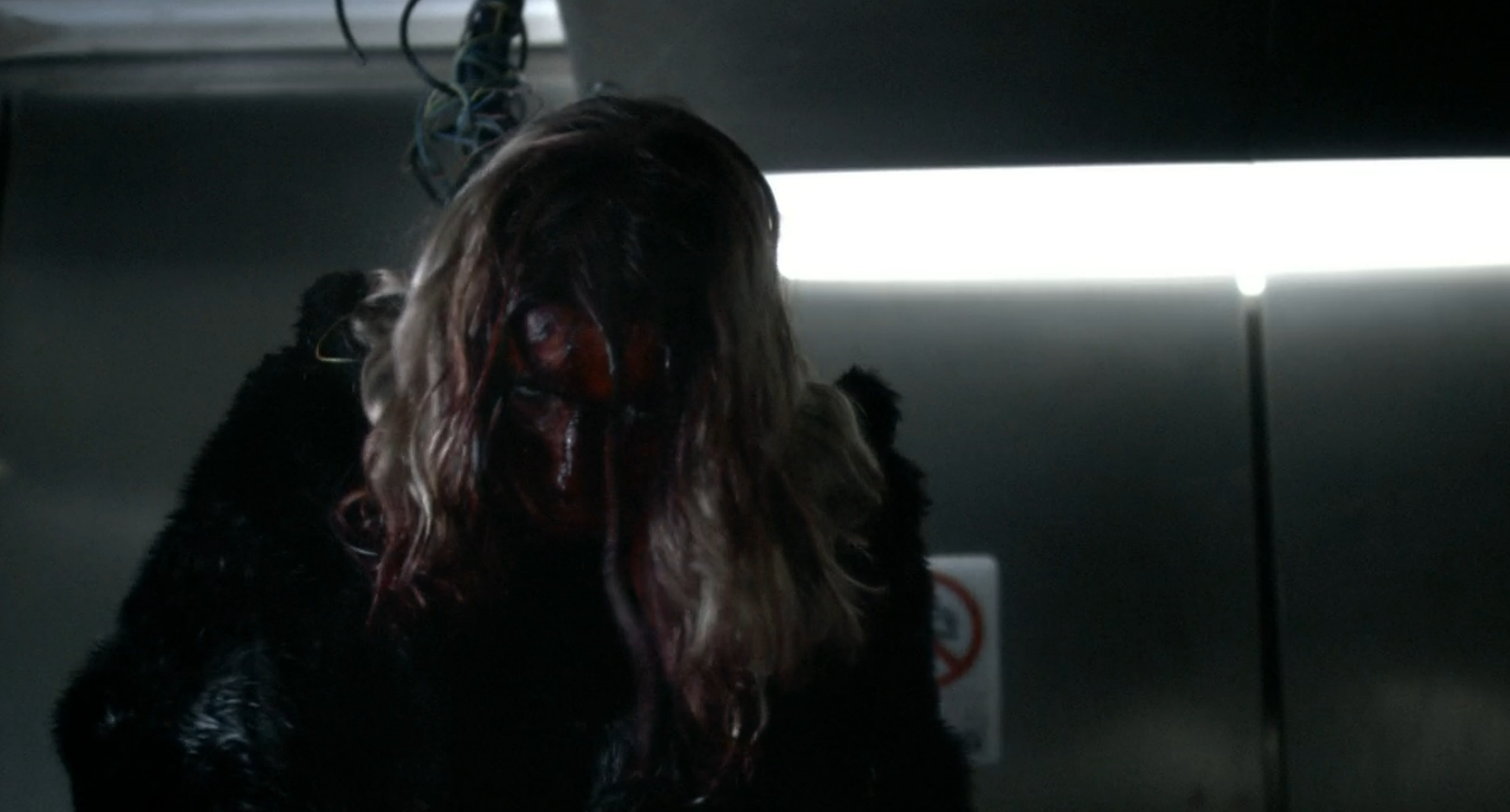 Instead, the proceedings are taken over by your standard, faceless slasher villain, who dons some sort of black gimp mask and hides in the shadows. Which would also be fine, except then that would make this one of the dullest slashers ever. Granted, it does start off okay, with the first guy being killed by being hung upside down and bled like a pig. But the thing with successful slashers is, typically you have to UP the tension, violence and dread with each subsequent death. And sadly, this film just cannot do that. You can tell that it wanted to. I mean, you can practically FEEL their desire to use Saw or Hostel levels of icky ooey-gooey goodness. But like I said, the movie is cheap. They clearly didn’t have the budget to match their ambition. So people are killed in either ridiculously easy ways, killed just off screen, or they’re killed on screen, but with a lot of close-ups and quick editing to keep all the blood and guts they want to show you at a minimum. I mean, they couldn’t even spring for one single trap. They do try to convince you that the elevators are trapped, and one lady does die in one, but for the life of me I have no earthly idea how the hell that “trap” was supposed to have worked. Like, she got in, the doors closed, she screamed, the doors opened, and then she’s hanging by some wiring that’s coming from outside the elevator. I mean…how the fuck did that happen? How do you rig wires to slide down and hang someone like that without the full cooperation of the victim? Or if the killer was supposed to have done it, how did they get in there, hang her, and then get out without any signs or sounds of struggle? I swear it might be one of the most puzzling deaths I’ve seen in one of these things..