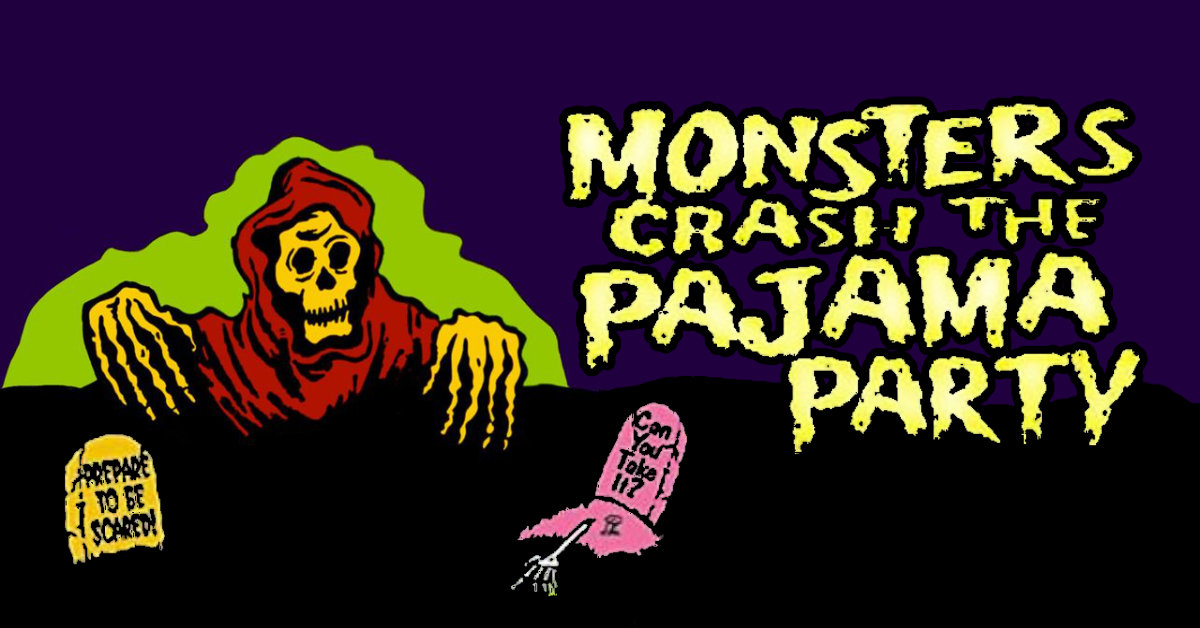 Monsters Crash the Pajama Party is a short American horror comedy from 1965. The film was made to to be part of the “theater spook show” circuit, which is sorta similar to the other cinema “gimmicks” of the era popularized by William Castle in the late 1950s, wherein he’d have certain chairs vibrate or skeletons would fall down from the ceiling at specified moments to try to give the audience an extra jolt. In the case of this film, it involved costumed actors “exiting” the screen to go into the audience and abduct a pre-planted “victim” to then bring back into the film. So it was kind of a form of interactive theater, and was meant to be part of a larger show. Hence the reason why it’s a short, and why it’s not meant to be taken at all seriously.